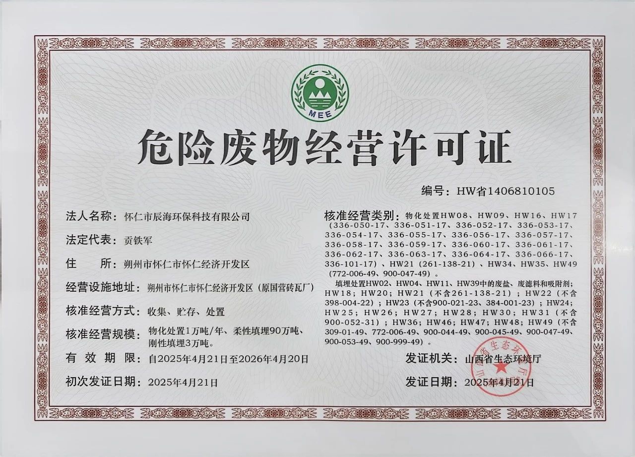 近日,懷仁市辰海環(huán)??萍加邢薰荆ㄒ韵潞?jiǎn)稱“辰海環(huán)?!保┱绞盏缴轿魇∩鷳B(tài)環(huán)境廳頒發(fā)的《危險(xiǎn)廢物經(jīng)營(yíng)許可證》,這標(biāo)志著辰海環(huán)??梢婪ㄩ_展危廢處置業(yè)務(wù),為助力山東環(huán)保集團(tuán)和生態(tài)公司拓寬營(yíng)收渠道,擴(kuò)大市場(chǎng)份額奠定了堅(jiān)實(shí)基礎(chǔ)。