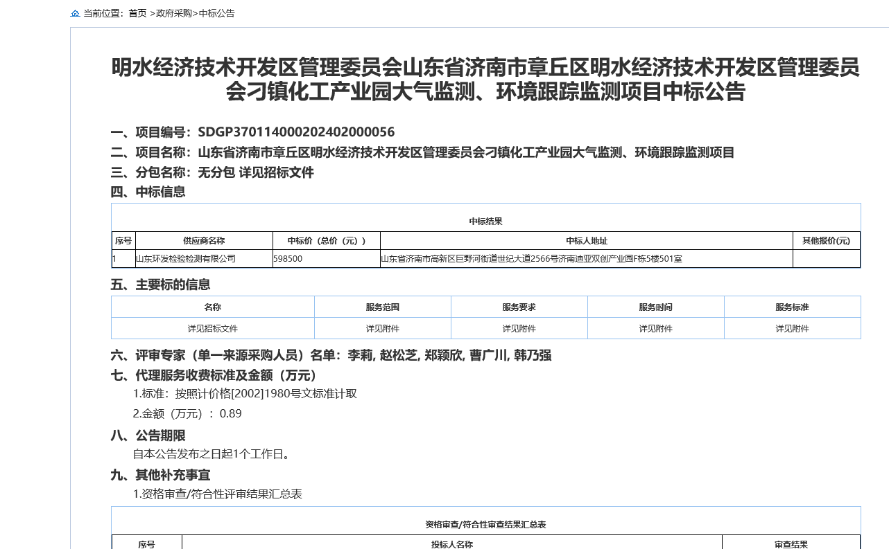 7月25日,山東環發檢驗檢測有限公司成功中標“山東省濟南市章丘區明水經濟技術開發區管理委員會刁鎮化工產業園大氣監測、環境跟蹤監測項目”,