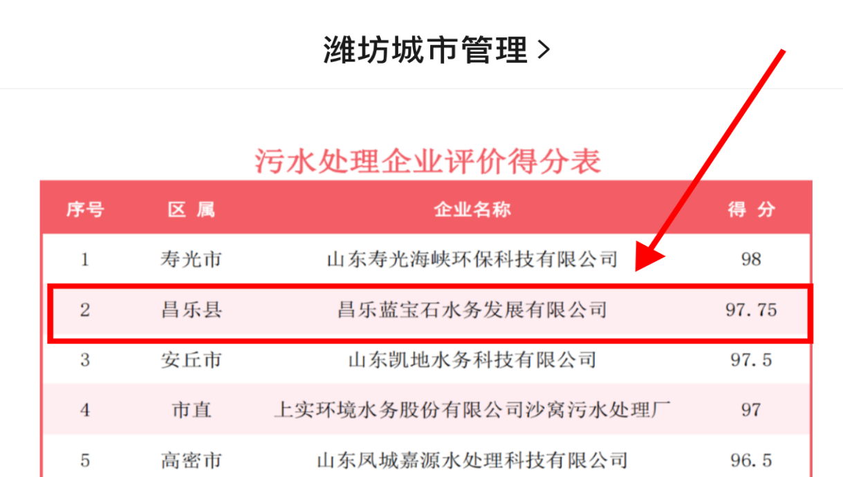 2024年1月上中旬,濰坊市城市管理局組織對全市供水、燃氣、供熱和污水處理等4大類121家市政公用企業進行了2023年度運行服務質量評價,昌樂水務以97.75分位居第二名,并獲得優秀企業風采展示的殊榮。