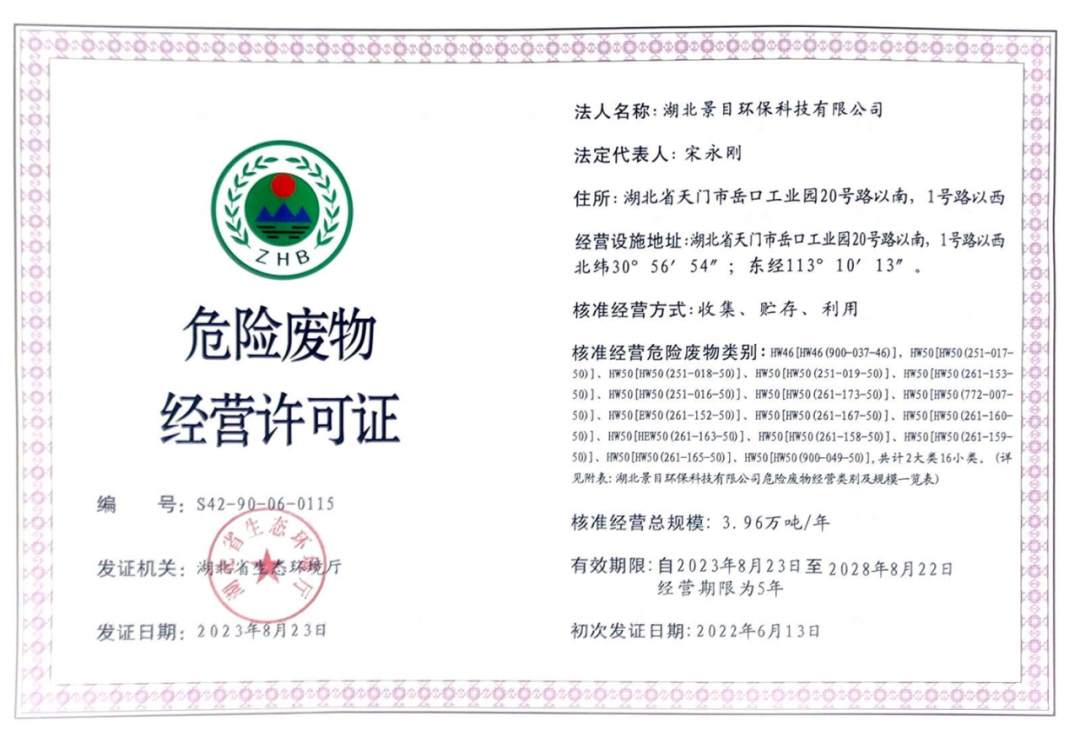 近日,湖北景目環保科技有限公司(以下簡稱“景目環保”)年處理4萬噸廢催化劑的資源化再生利用項目順利更換領危廢經營許可證(5年期經營證),標志著公司即將投入規模化生產,逐步走上高質量發展道路。