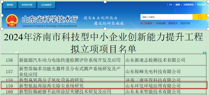 近日,山東省科學技術廳公布了2024年省科技型中小企業創新能力提升工程擬立項項目名單暨2024年山東省企業研究開發財政補助資金擬補助企業名單,山東環發環境治理有限公司榜上有名。認定現已公示完畢,立項金額600萬元,獎補金額預計40至70萬元。